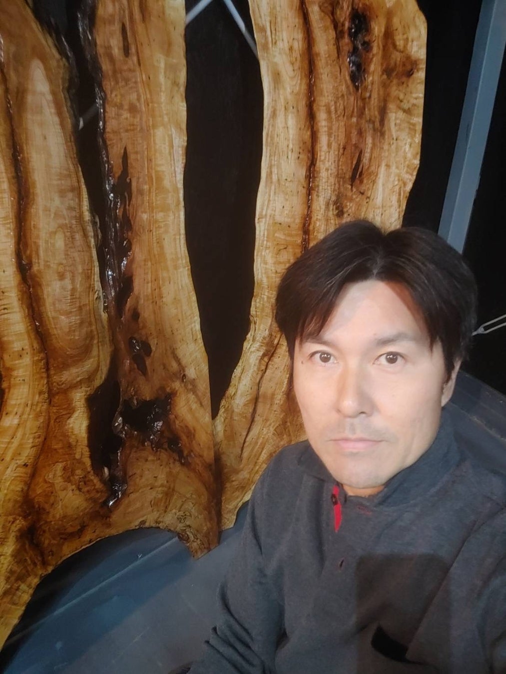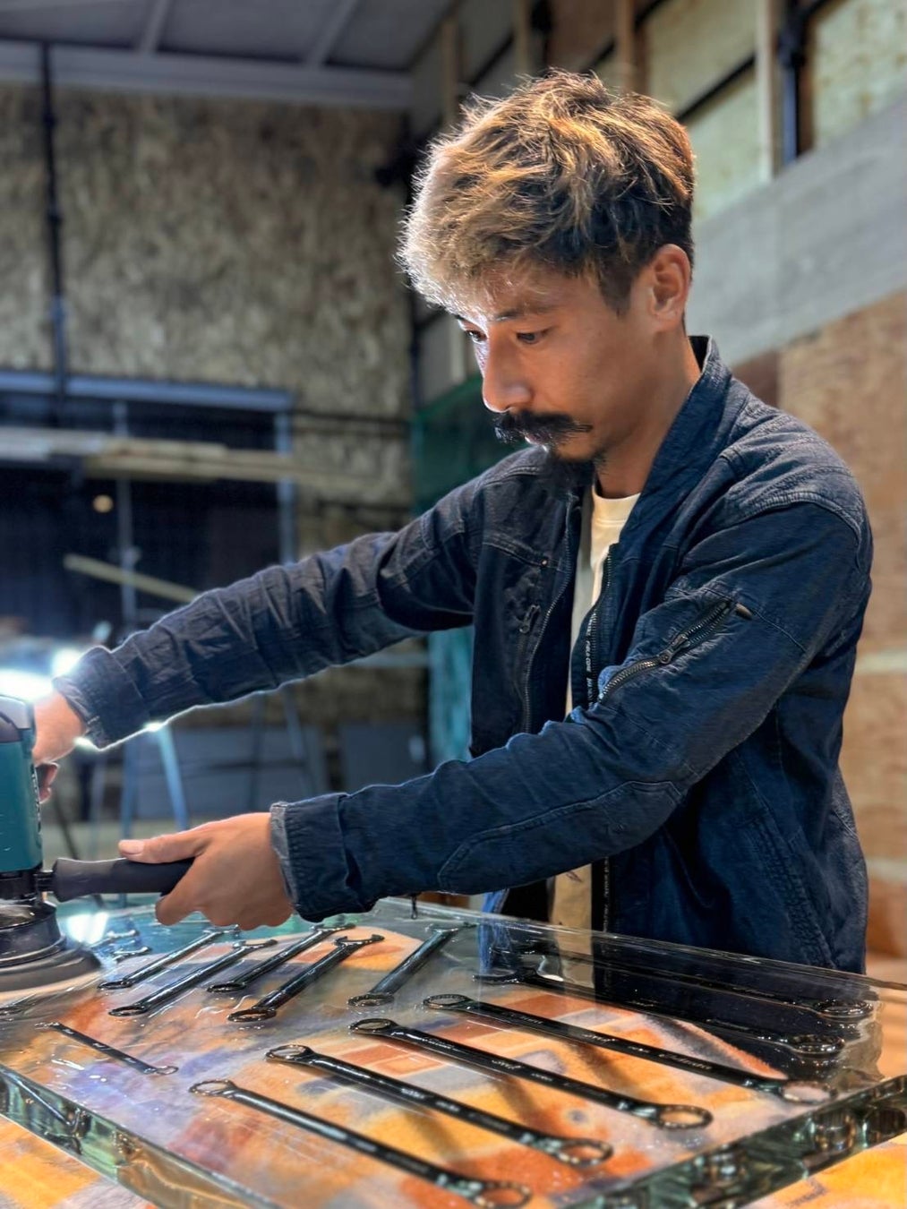 本業は塗装業だがレジンアートの世界に魅せられ、今では数多くのレジンアート作品を生み出している。古木をレジンで加工する家具作品が多い中、常識とは全く違う視点からのリクエストに初挑戦のツールやパーツを利用したレジンアートテーブル作りにも挑戦した。塗装業者ならではの精緻な作品として仕上がっている。